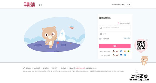 百度糯米的登陆页真正理解了简化副本的含义。页面文字的简化并不是文字越少越好,而是要用尽可能少的文字把意思表达清楚。左侧的图片上也没有多余的文字,色彩上也选择了淡色系,让整体看起来很舒服。