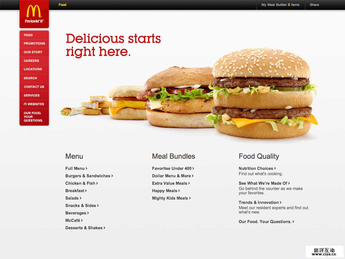 麦当劳LOGO中,黄色的拱门能够唤起用户新鲜、快乐的情绪,黄色还能引起饥饿感。LOGO中的红色所包含的活力感、愉悦和能量会促使用户快速地离开,这样也就促使餐厅中人流的快速流转。作为快餐店,这样的色彩搭配构成了麦当劳独特的品牌情感传达,和品牌故事。虽然麦当劳官网目前还没有追随设计潮流,尚需要一些设计上的提升,但是它的色彩非常简明,并且专注于视频领域的推广和传播。有意思的是,同LOGO相比,在网页配色上相对降低了红色所占据的比例,因为这家快餐巨头想留住你来浏览,而非促使你离开。