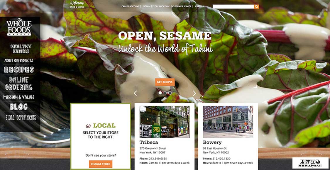 绿色常常被赋予自然、环境和治愈等含义,而Whole Foods正是一个全天然有机食品品牌。这些有机食品和品牌与绿色完美的融合在一起,Wholefood.com 网站中使用了大量的绿色的元素和形象,唤起用户对于自然的认同感,配合黑色和白色这种中性色来完成整个网站的设计,三种色彩在网站设计中达到了平衡点。