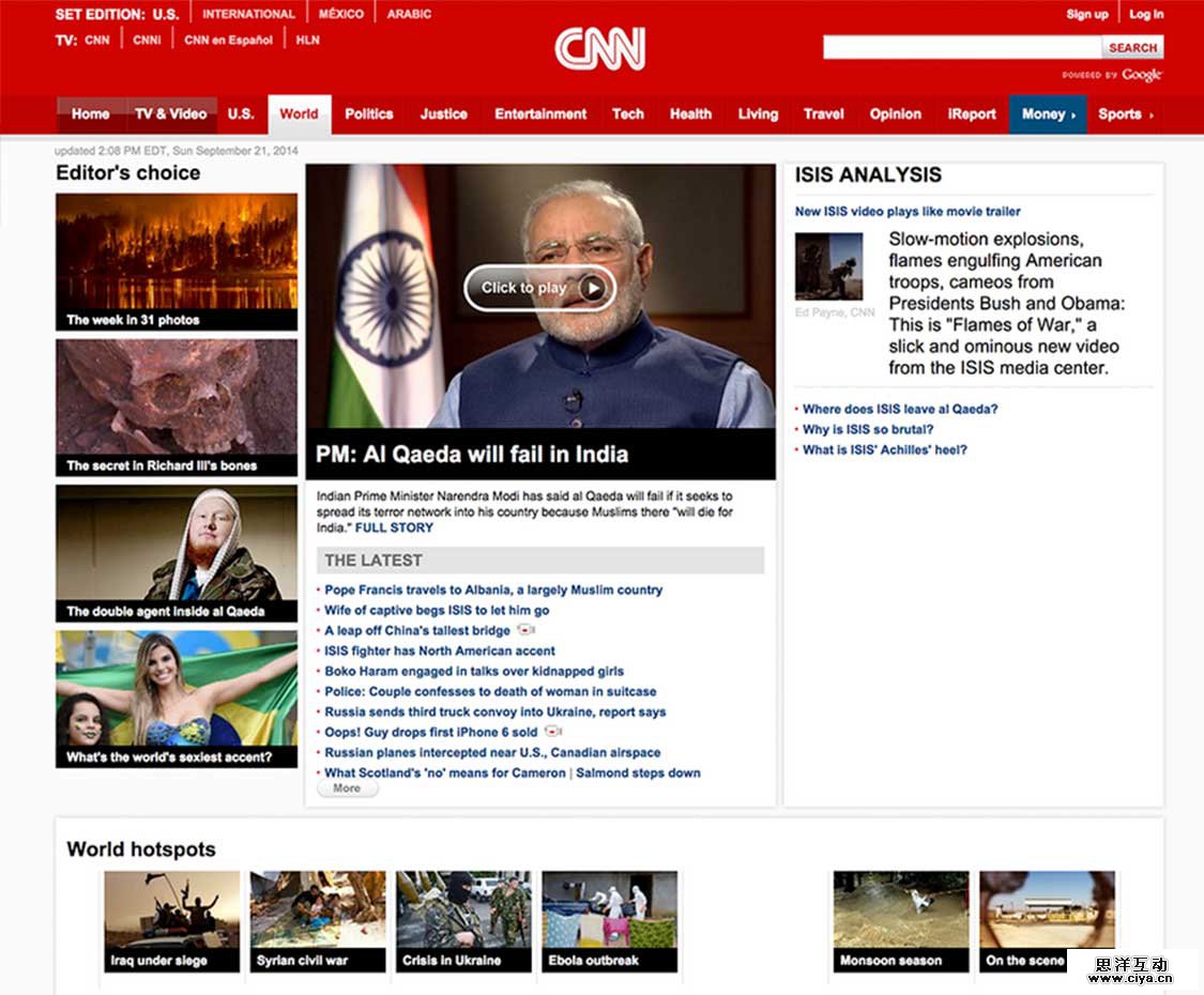 CNN也是如此,他们需要用户和读者来相信他们的新闻来源。所以CNN使用了红色来表现他们的领导地位,以及激情、能量的感觉。
