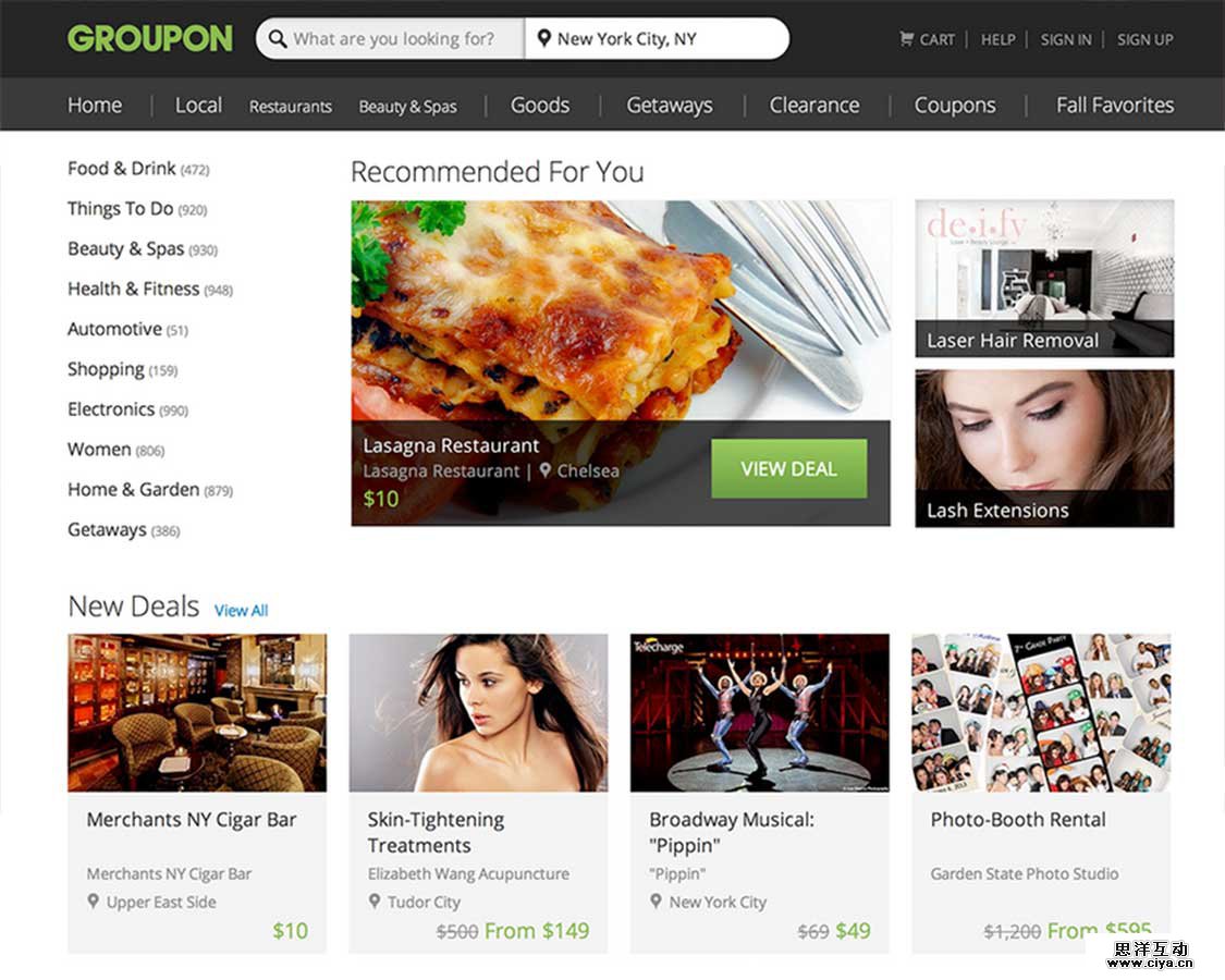 Groupon 使用了绿色和灰色来表现“节约资金”和“独特”的特性。
