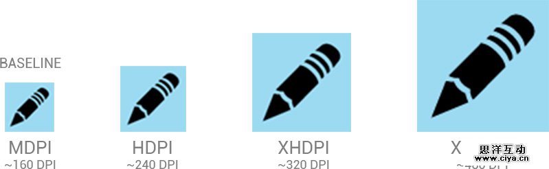 在Android应用中,以MDPI为基准界面尺寸,恰好对应上面提及的iphone应用的基准界面尺寸(320×480),所需的切图图标为iphone中对应的1倍图;XHDPI则对应2倍图,HDPI和XXHDPI可依此类推。