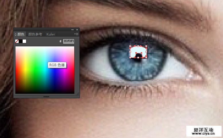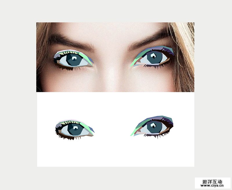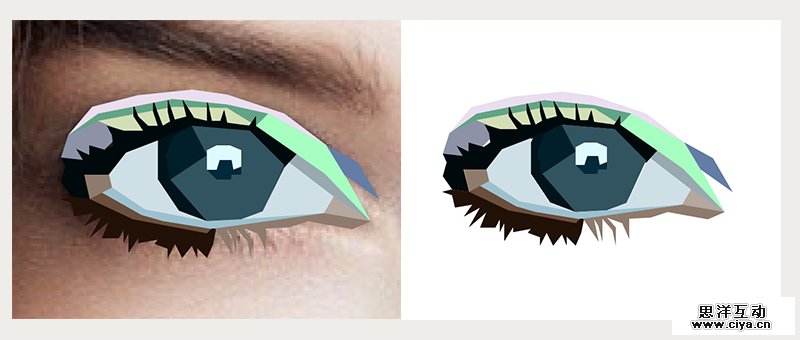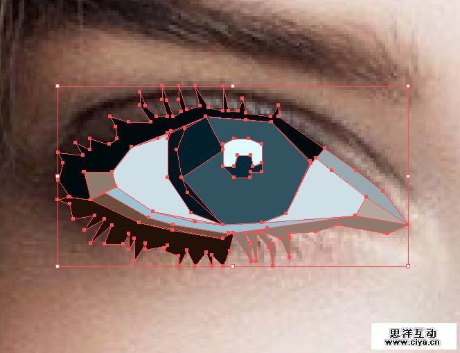 在眼球的其他部分也用钢笔工具来画,画的时候保持直线,在弧度较大的边缘处可以让锚点集中一点。锚点的起始选择都尽量与其他碎片保持一致,这样不会让图片无故中间多出很多“空隙”。通过“颜色参考”中颜色的深浅找到相应的配色,这也是让颜色保持协调的一个秘诀。