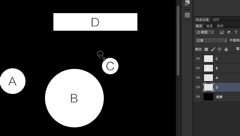 我们画A、B、C三个图层并调整其间距,另画一层D,现在我们想让ABC之间以相对不变的间距与图层D进行对齐,我给出了如下的方法: