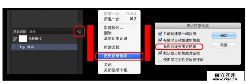 上图是开启了非线性历史记录的状态,可以看到在我进行撤销操作后在进行的操作,其记录会承接之前的步骤,也就是说,无论是否被撤销,所有的历史记录都将被保留,这样我们做图时的灵活性就变得更强了,当然弊端也不少,一是开启之后历史记录条数将增长得飞快,耗资源不说,关键步骤被刷掉就悲催了。再就是习惯问题了,我第一次开启时感觉务必的别扭……新鲜劲儿过去了就改回来了,不知各位看官是否有用得习惯的~