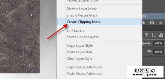 将选区复制粘贴到我们的文档,然后把它放在文字图层的上面。右键单击图层并选择“创建剪贴蒙版”: