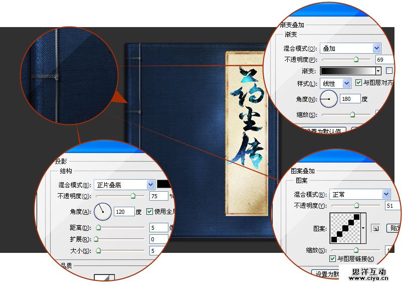 做出锁线装订书籍效果,添加了投影、渐变叠加、图案叠加样式。