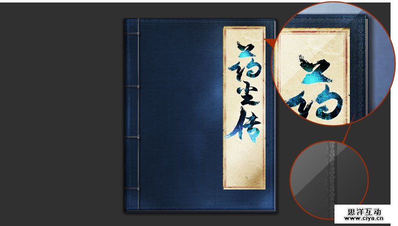 书边缘添加花纹材质,书脊增加高光、阴影。用明暗表现书面凹凸不平效果,丰富封面层次。给字体添加纹理光效。