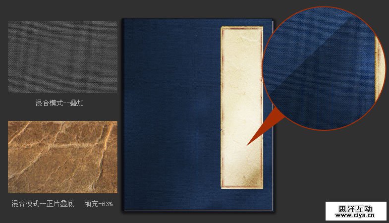 添加布质纹理效果。用明暗表现书面的凹凸不平。书面标签强化纹理材质,明暗光效,破旧效果。
