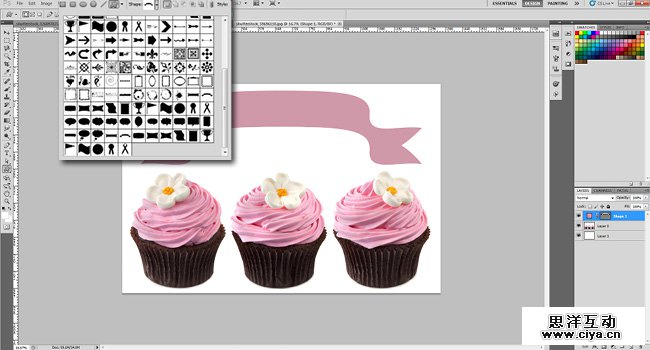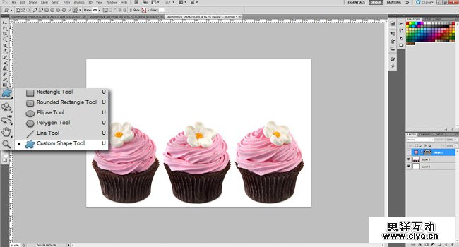 工具面板包含所需的基本形状,如方块,线性,圆圈,椭圆等。不过如果你希望有更多的扩展选项,你可以点击自定义形状功能。在功能框,你可以轻易找到自定义按钮,就是那个像被轧死动物(你想多了)的按钮。当你选择之后,多样的形状图案就会出现。