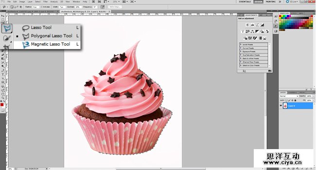 若要使用磁性套索,可以点击套索工具并保持不放,在相应弹出菜单中,你可以看到底部的磁铁按钮。选择按钮后,使用鼠标对图像的边缘进行选择。点击鼠标,随后放开,并沿着所选的物体边缘继续下去(就像使用剪刀剪裁一样)。