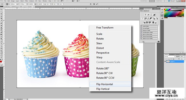如果想要水平或者垂直翻转图片可以按”Ctrl+T”并单击右键。在弹出的窗口中有关于旋转或翻转的选项。选择相应的动作并点击“Enter“。