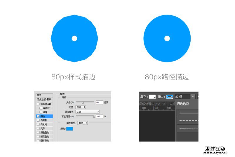 我们在绘制图形采用图层样式做描边效果时,如果用到较大的数值,描边会产生分块曲线,边缘有锯齿感。那么我们通过矢量描边处理可得到完美的结果。我猜测这是因为,矢量描边是由原始的矢量形状图层数据而来,而图层样式的描边是由该形状的位图蒙版而来。二者采用的是完全不同的技术,这样就可以想明白了。