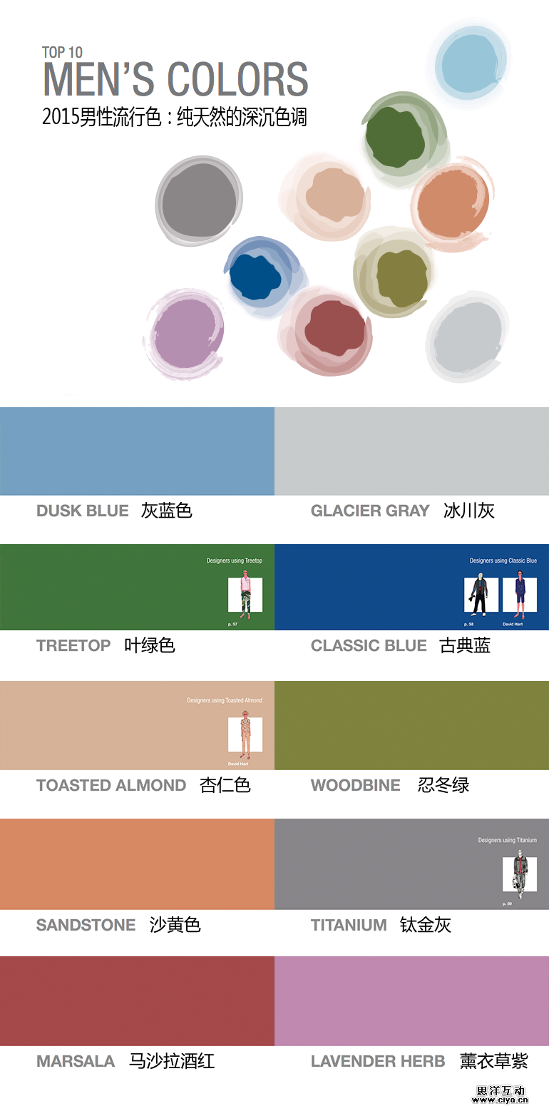 2015的男性流行色有不小的转变(我感觉有些偏女性呀),更加强调即兴搭配,来自自然的色彩和基本色互相混搭,创造了一系列平易近人、成熟老练风格的流行色。