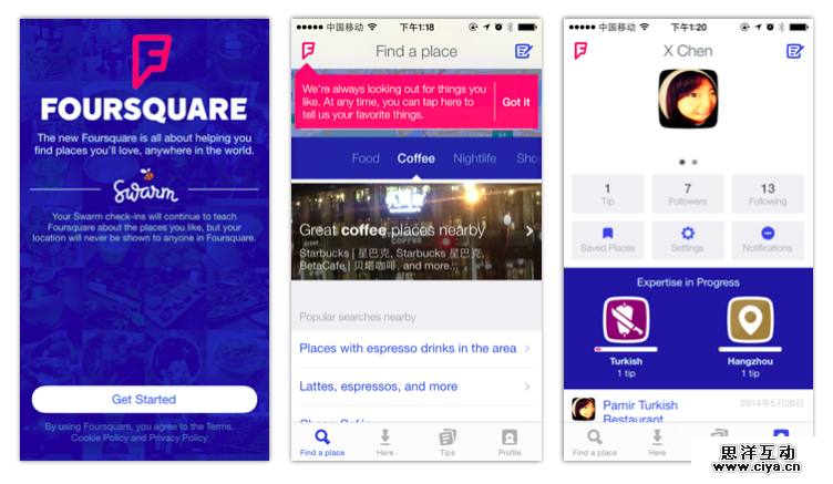 关于流行色在界面中的应用,关键是产品自身需要什么样的气质、希望给用户什么样的印象和感受,颜色本身都是美的,设计的美不美,则看设计师的功力。比如今年流行的闪蓝色(Dazzling blue),我曾一度认为这种饱和度很高的颜色很难用在界面中,特别不能作为主色,可是新改版的Foursquare让我眼前一亮,可以说个性十分鲜明: