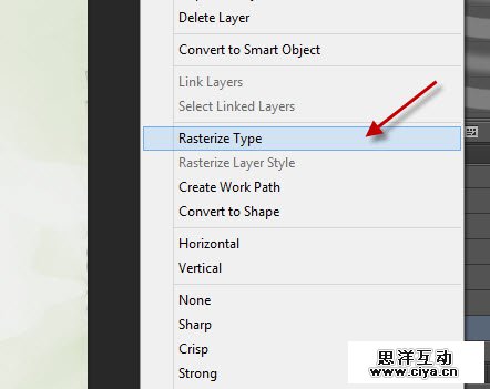 5、将这个文字图层复制一次,并隐藏原来的文字图层,然后在复制出来的副本上右击鼠标,选择“栅格化文字”,如下图所示