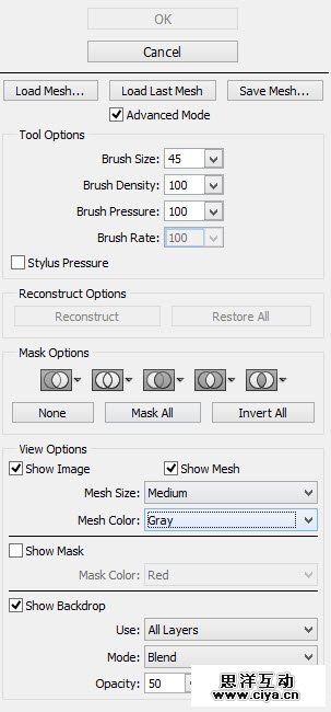 6、然后选择液化工具(滤镜>液化),具体参数设置如下