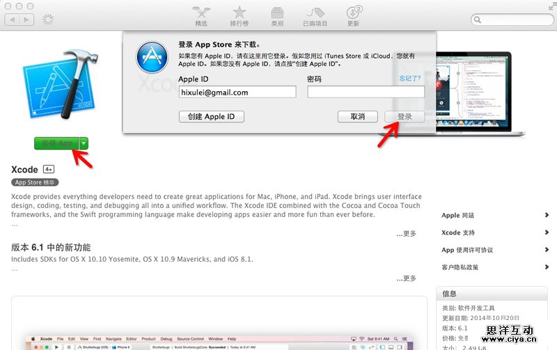 接下来会打开mac系统自带的App store,选择安装App按钮.输入苹果ID就可以下载了(相信使用iphone设备的同学一定是人手一个id的)