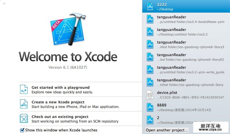 打开xcode会出现欢迎界面,界面如下.静电接下来一个一个为大家介绍。