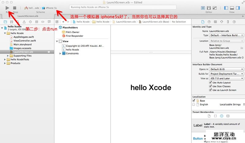 如果没有什么问题的话,你会在模拟器的启动画面中看到hello xcode的字样,这样 一个空白的,有着hello xcode字样的简单app就完成了(启动画面小消失很快,记得盯着模拟器看哦。否则你会看到大白边,啥都没有)怎么样,简单吧? 如果大家没看到,请点击一次stop,然后再运行一遍。