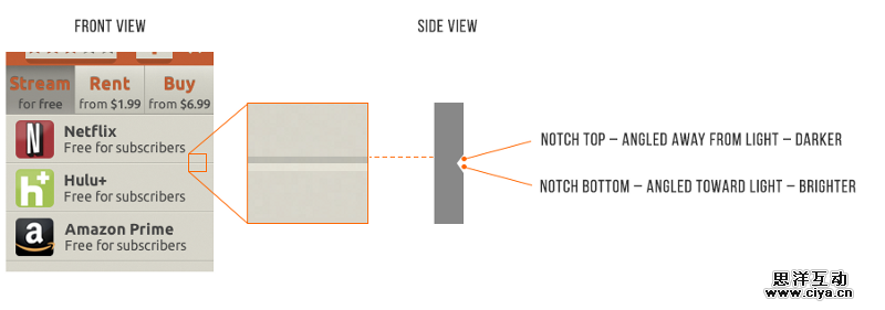 这么一个简单的按钮就有4种不同的光线变化。实际上,我们可以把这种原则运用到各处。