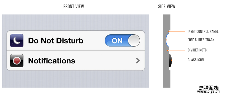 iOS 6有点过时了,但还是学习光线不错的案例。这张图是iOS 6“勿扰模式”和“通知”的设置,看看上面有多少种不同的光线变化。