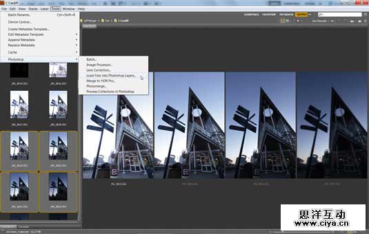 你可以将一组照片以图层形式打开,你只需要点击 工具->Photoshop->加载文件 就可以了。