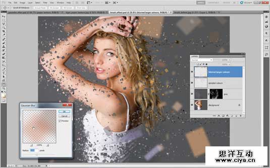 使用套索工具选择女孩,然后点击Shift+Backspace快捷键,选择填充(内容识别)。按住Alt按键,点击增加蒙板的按钮,将前景色设置成白色,在蒙板上涂抹,让女孩的部分图像隐藏。接下来增加一个新图层,按住Alt按键从女孩身上取色,然后涂抹颜色。之后,再新建第二个图层,绘制更大的区域,使用高斯模糊滤镜。大功告成!