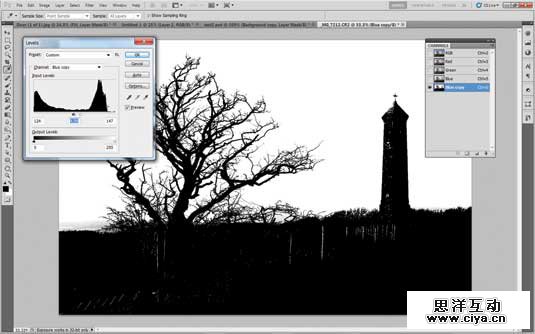 去通道工具窗口拖动蓝色通道到创建新通道的按钮上,复制它。点击Cmd/Ctrl+L调用色阶,拖动调整,让天空全白,而地面全黑。接下来使用画笔工具,用黑色将地面部分涂抹平整。