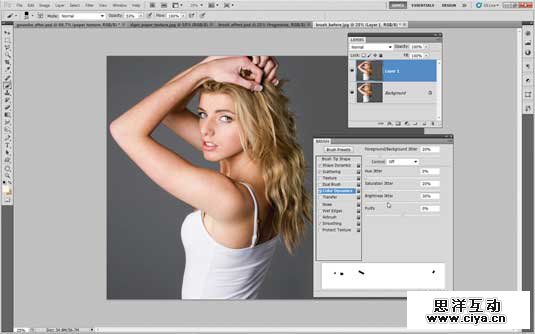 选择一张常见的肖像图,然后选择一个方形笔刷,并且应用下面的设置:间距631%,大小、角度、抖动都设置为100%,散射:638%,数量抖动50%,颜色动态:前景/背景抖动20%,饱和度抖动20%,亮度30%。