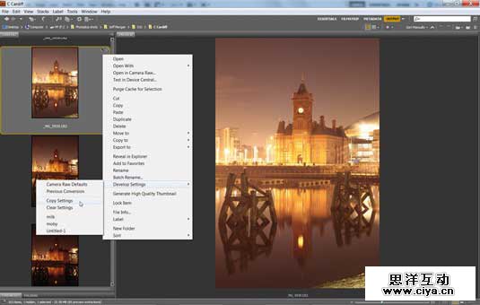你可以在Bridge中将ACR的处理过程从一个图片中应用到另外一个图片中,在Bridge中,在圆形图标上点击右键,选择 开发设置->复制设置 然后在另外一张图片上右键点击粘贴,就好了。