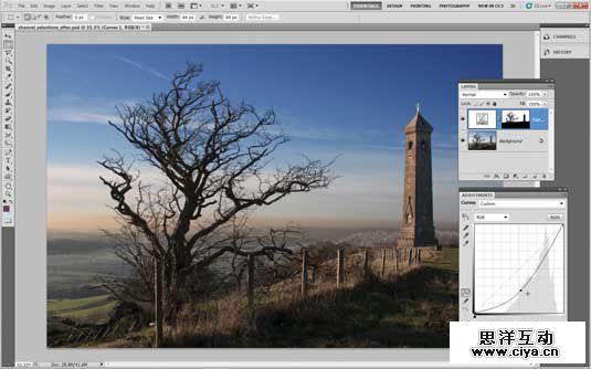按住Cmd/Ctrl按钮,点击蓝色通道,选中白色的选区。回到RGB通道模式下,在图层面板中新增一个曲线调整图层,选区就自然变成一个蒙板了,调整曲线,就可以改变天空的色彩了。