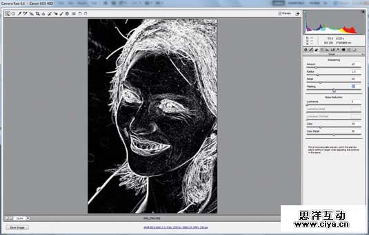 在详细信息面板中,调整蒙板滑块,可以调整图像区域中的锐化程度。但是你如果想更详细地掌控锐化程度的话,需要按住Alt按键。灰阶图可以帮你了解锐化程度。