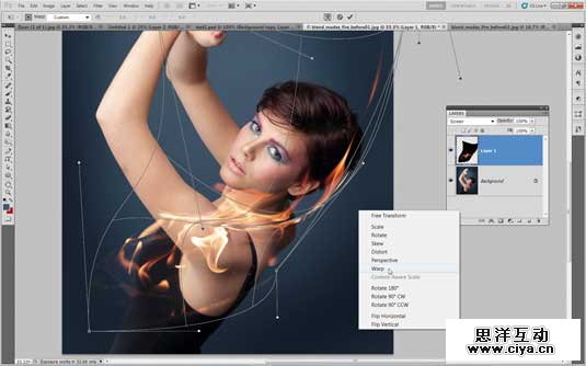 单击边款,改变火焰的图层,调整大小,旋转,定位。在调整状态下,鼠标右键点击调出菜单,选择“扭曲”,调整火焰姿态。使用快捷键Cmd/Ctrl+J 复制图层,通过叠加图层调整效果。