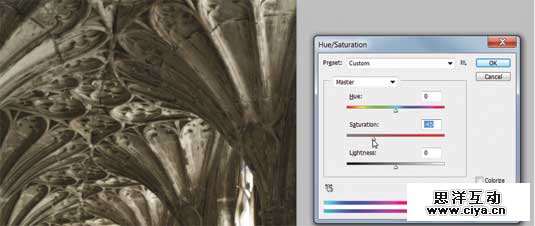 扩散亮光滤镜可以让图像呈现出柔软飘逸的感觉,尤其是当你你调低饱和度之后。单击D让色彩复位之后,在菜单 滤镜->扭曲->扩散亮光 或者在 滤镜->滤镜库 当中找到这个隐藏的滤镜,然后Cmd/Ctrl+U 快速调出调节饱和度的面板,调整饱和度。