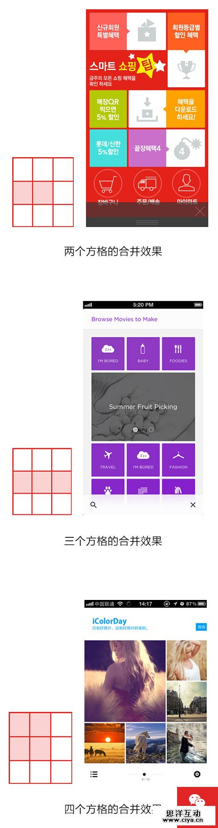 在九个方块分配的时候,不一定要一个格子对应一个内容,完全可以一对二,一对多,打破平均分割的框框,增加留白,调整页面节奏,或突出功能点或广告。各个方块的不同组成方式,页面的效果也会产生无数的变化。