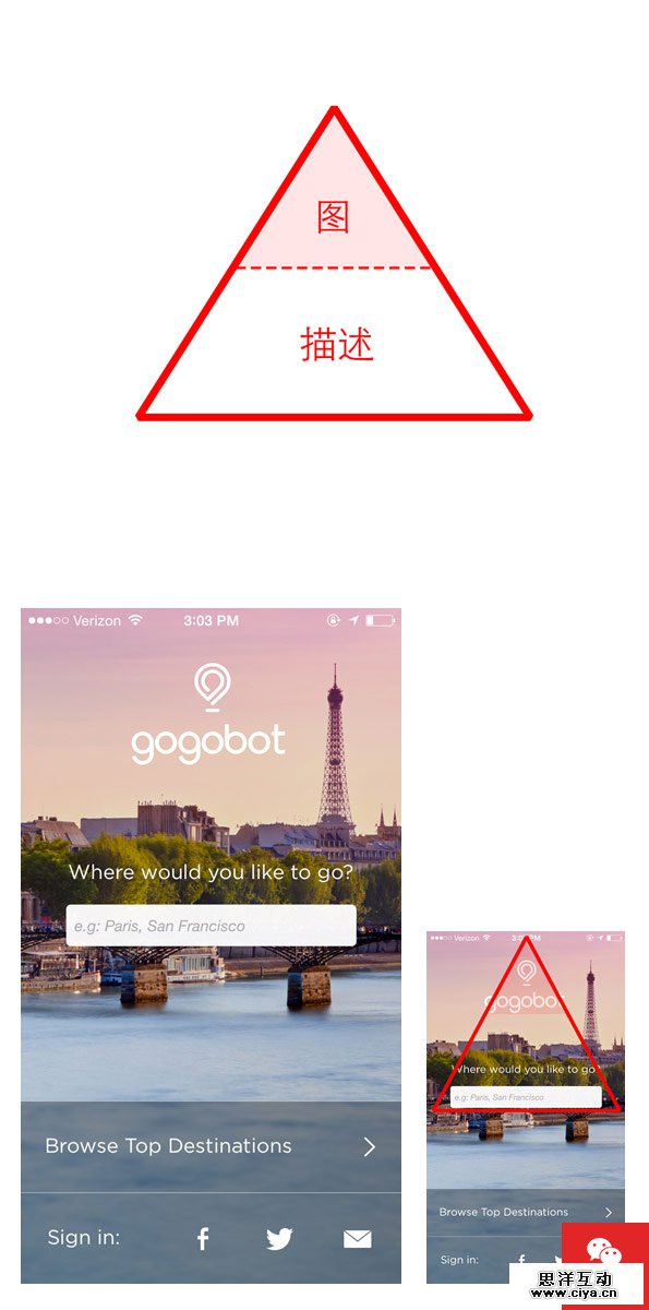 在界面中三角形构图大部分都是图在上,字在下,阅读更为舒服,有重点有描述。