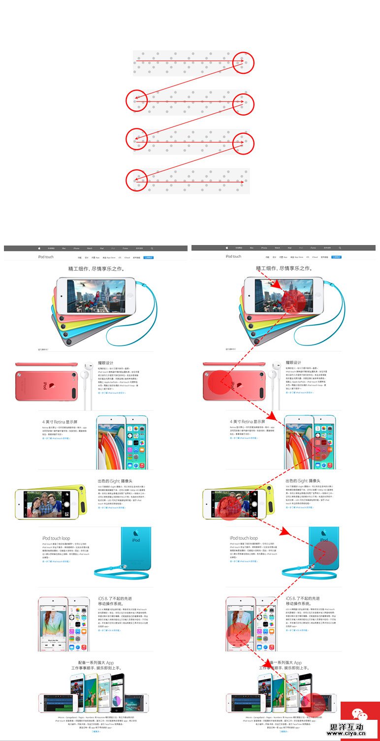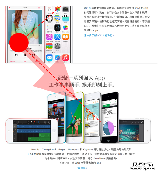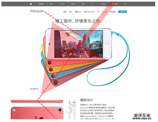 在iPod touch 的介绍中,第一张图片展开的效果用到了三角形构图,强化了引导视线轨迹的指示性。同时多张图片借助手机排列方向引导到视线轨迹,很好地实现了图片—文字—图片之间切换,将用户带入到整个产品画面中。