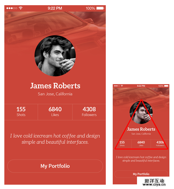 下图界面中,设计师很好的运用到S视线形构图,增强了穿插感和灵动性。人物的信息上下穿插布局,头像则成为视线的转折点,使这种双列模式的排版更为有节奏。而具体到每一部分,头像与内容采用了三角形构图,内容描述段落用到了文本居中式,画面稳定、和谐。