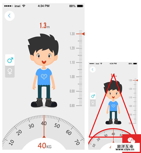 当时在设计儿童卫士宝贝信息设置页时运用到了三角构图与圆形构图的结合。将体重刻度做成可滑动操作的方式,而卡通形象来突出设置的对象及这个页面的功能。