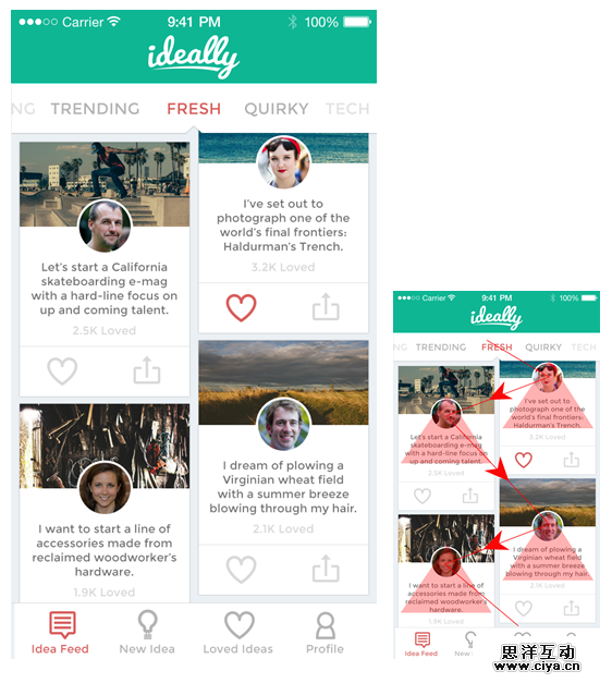视线流动的轨迹多则是从上至下从左到右移动,如果不能围绕这样的视线轨迹进行排版,用户在阅读的时候会变得很吃力,找不到重点,使用户产生反感。所以在界面设计中格外需要注意这个地方。现在界面一般是上下滑动的,做好视线引导,可以大大减小用户的负担和阅读疲劳。