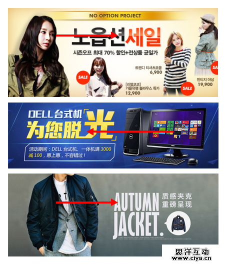 值得注意的是,要充分利用主图的画面的指向性。比如,主图是人物,可将文字放置于其眼神、朝向、手势等对应的方向,加强视线引导。如果是产品图,则可以通过产品的朝向来引导。这样做,用户能最快速的关注到文本信息,加强认知度和购买度。