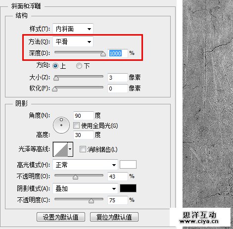我这边通常用到这个效果的时候是分别选为“平滑”和“1000”,可以使斜面的分割清晰而且不会出现杂边。下面的高光和阴影通过不断看效果图去调整。样式调整完之后找一张墙壁的素材叠加到底部,再根据叠加之后的效果做相应调整即可。