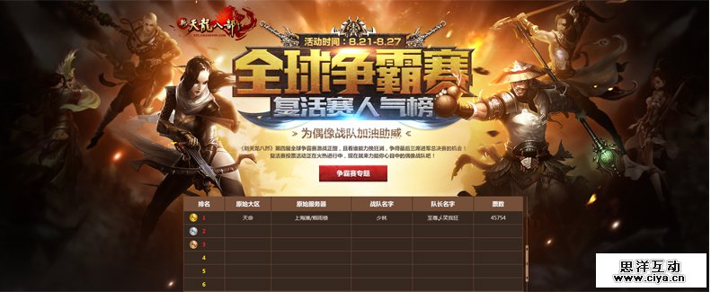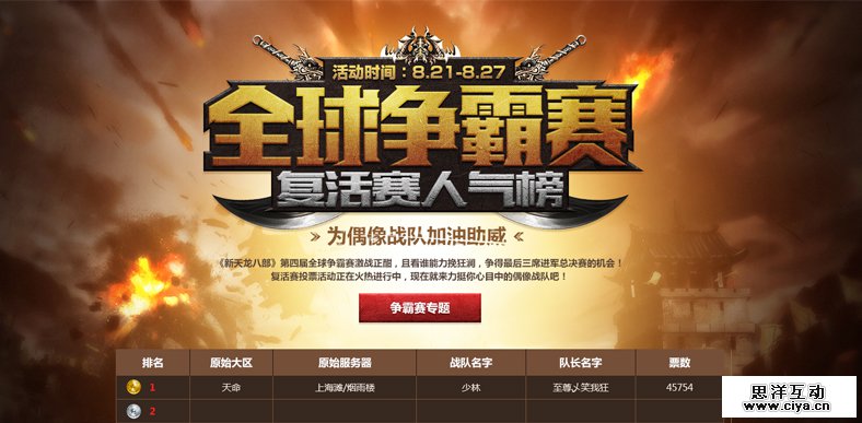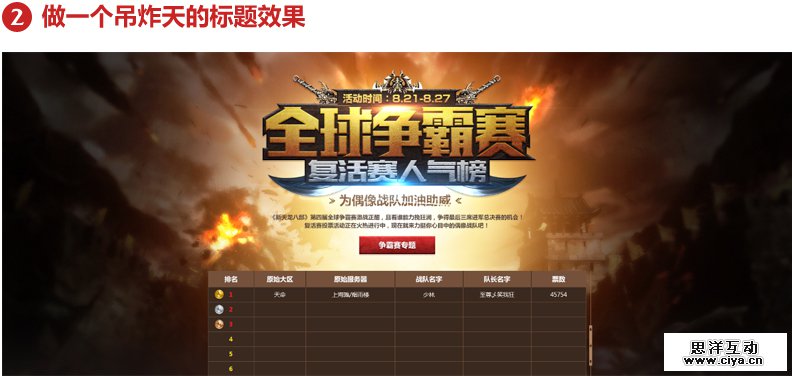 这是一个天龙全球争霸赛复活赛的专题页面,这里也许有人会有疑问,为什么不把复活赛重点突出,这是跟需求方沟通之后的结果,通过他们了解到主要还是以争霸赛为主体,复活赛作为副标即可(前期沟通很重要)。OK,既然主题”全球争霸赛“很明确,那我们就可以围绕这个去进行专题的构思了。