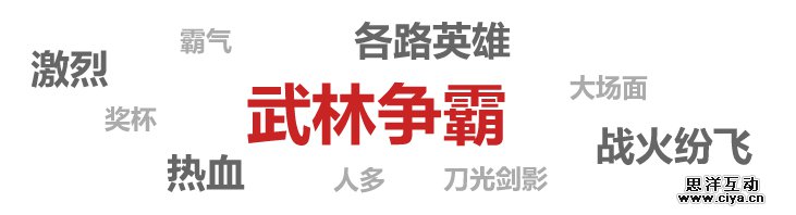 首先,还是在脑海里想象下所要打造的一个大概的场景。各路英豪争夺全球第一,反映到游戏中自然也就是各门派的英雄去争夺武林盟主的感觉,可以把英雄围绕四周,中间放一个类似奖牌的物品,那么大致的场景及场面基调也就可以定下来了。我们还是先提炼一下关键词: