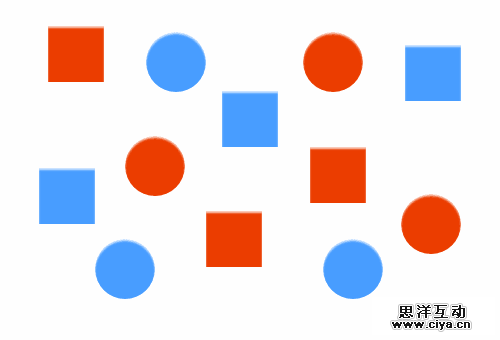 你也许首先注意到颜色,将元素划分为红色和蓝色。这就说明,颜色所传递的等同的信号比形状更强。这也不是完全绝对的,举个例子,一些红绿色盲的人就不会注意到颜色的区别,他们首先注意到的是图形的形状。
