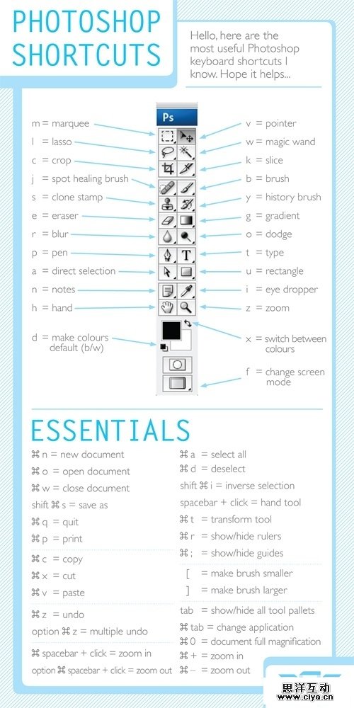 图是好图,不过得有点英文底子,想直接看中文的设计师,就这篇啦:《这50个PHOTOSHOP快捷键技能你用起来了吗?》