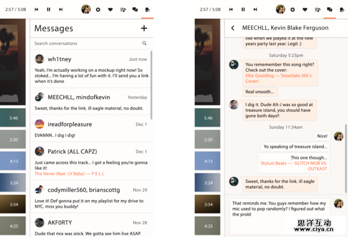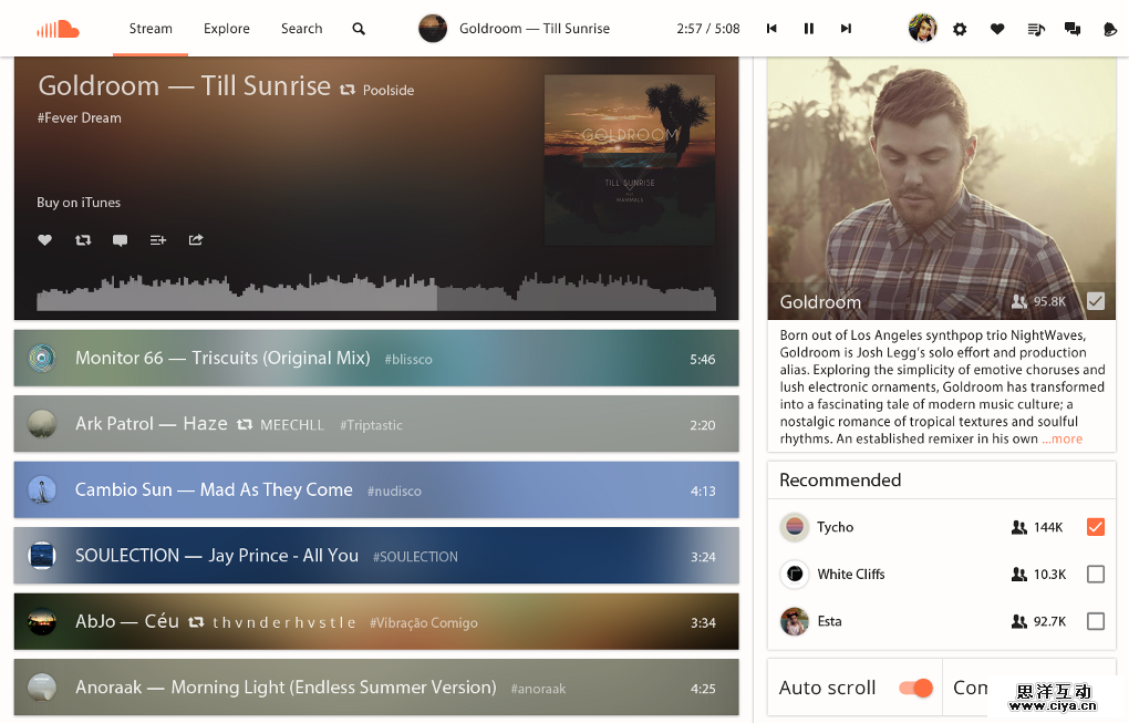 信息流概念图,我在SoundCloud上找到一些超赞的歌来模拟界面,右边栏是固定式的。展开的尺寸、大幅的插图和可见的波形图,清晰地标示了当前播放的歌曲。另外,相同空间里可以显示更多歌曲。