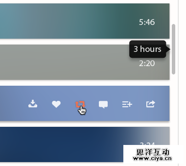 下载、喜欢、转发、评论、添加到播放列表和分享按钮被图标替代。这些图标已经充分传达了它们的功能,不需要再转译为其他语言。为了保持界面简洁,图标只在鼠标悬停状态显示(但当前歌曲会一直显示)