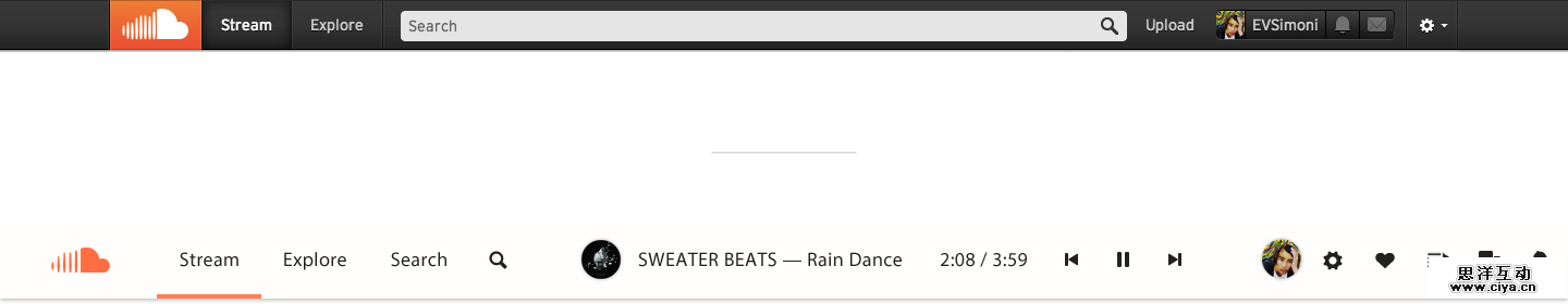 重要的链接在导航的右边,不再缩在下拉菜单中。头像图片指向用户的个人资料,右边的图标分别指向设置、喜欢、播放列表、消息和通知。上传链接去掉了,因为它并非随时随地需要使用。它被归到个人资料页面中。